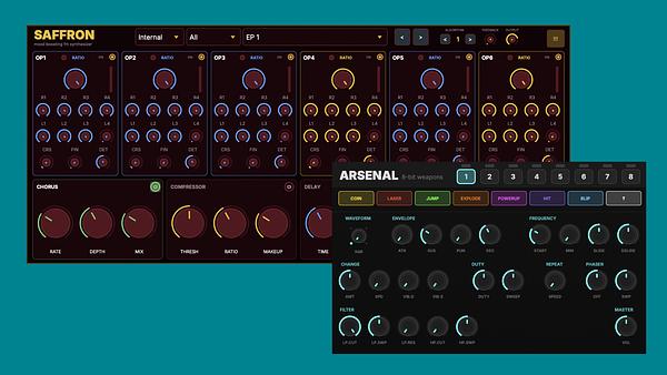 Az új pluginok közül kiemelkedik a Saffron, egy hatoperátoros FM szintetizátor, amely DX-7 kompatibilitást kínál, beépített effeklánccal kiegészítve. Ez a hangszer egyértelműen a klasszikus FM-hangzás előtt tiszteleg, miközben a mai produkciós környezetbe illeszkedik. Az Arsenal ezzel szemben egy 8-bites, retro hangulatú perkusziós gép, amely különböző dobtípusokból generál karakteres, lo-fi jellegű hangokat.