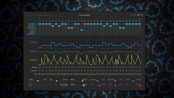 A Cluster v3 lehetővé teszi a szűrő manuális vezérlését, beleértve a cutoff és rezonancia paramétereket, valamint opcionális RMS limitert minden szűrősávhoz. Újdonság a lépésenkénti pan randomizáció, amellyel a hangzás még élőbbé és kiszámíthatatlanabbá válik. Egy presetben akár nyolc különálló szekvencia is elmenthető, amelyek azonnali variációkat adnak a hangzásban.