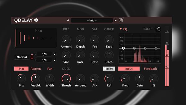 A QDelay nem áll meg az alapfunkcióknál. A haladó hangformázási lehetőségek között szerepel a visszafelé delay, amely azonnal pszichedelikus vagy kísérleti irányba tolja el a hangképet. A beépített diffúziós processzor segítségével a delay könnyedén reverb-szerű textúrákká alakítható, így a plugin atmoszférikus környezetek létrehozására is alkalmas. A modulációs motor finom mozgást ad a delay időnek, míg a szaturációs egység karaktert és enyhe torzítást visz a visszhangba, anélkül hogy az uralkodóvá válna.